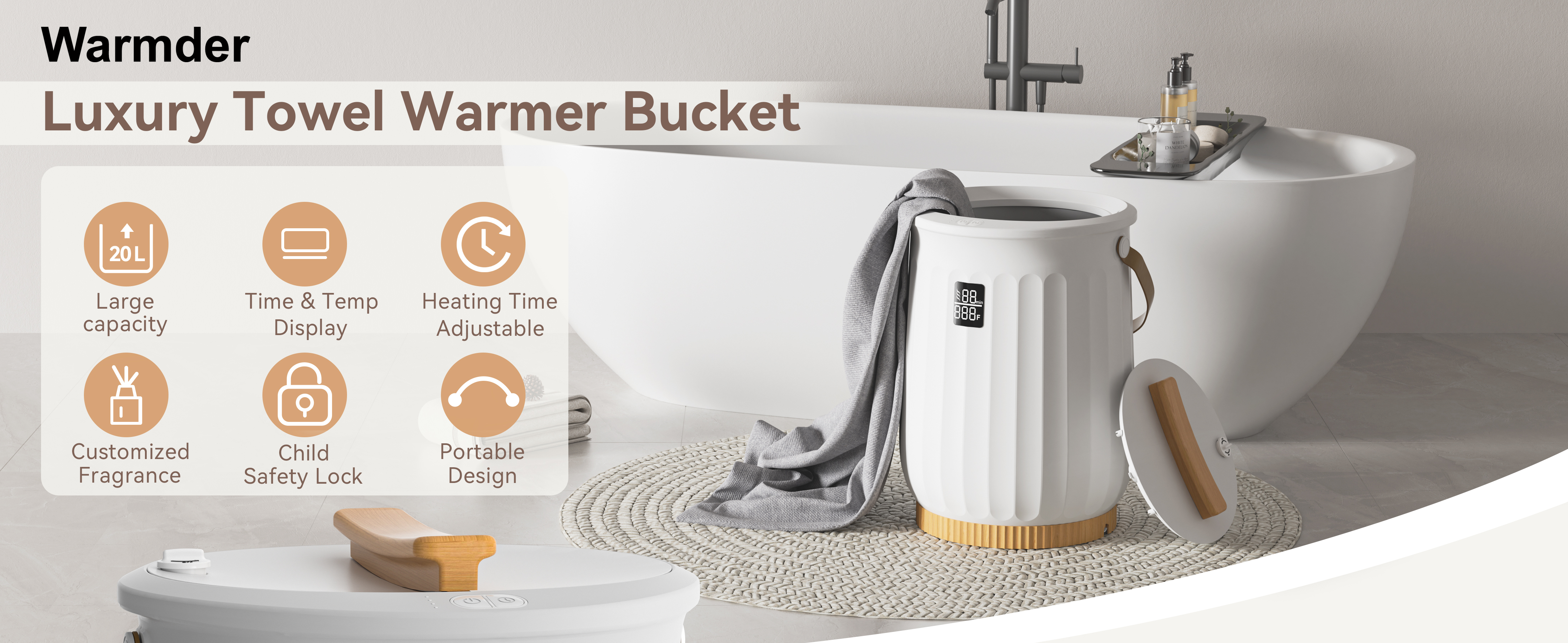 Large Capacity - Ultra large Bucket towel warmers for bathroom, accommodates up to two 40" X 70" oversized bath towels, bathrobes, blankets, PJ's and more. Dimensions: " 14.9 (L) x 14.9" (W) x 21.06" (H) , total 21 L capacity fits for whole family needs!