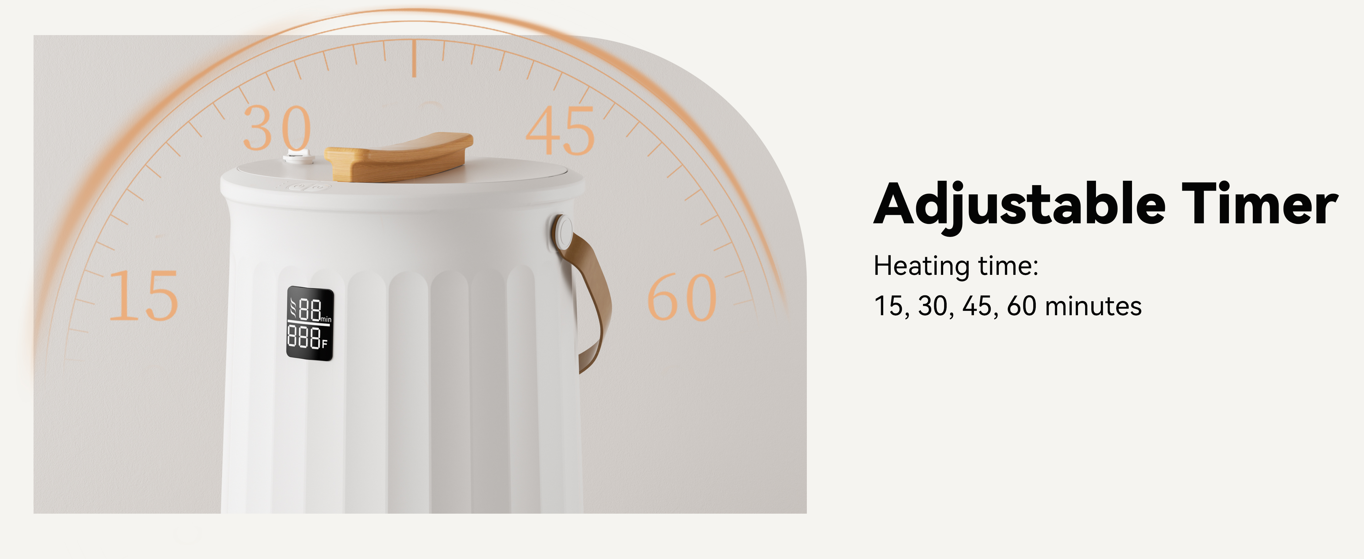 Bucket towel warmers: Heats the bottom and sides quickly in 1 minute, reach 266℉ in 5 minutes. The double-button design can quickly set the heating time of 15/30/45/60 minutes, the LED screen can display the remaining working time and the temperature in the barrel. When the temperature is too high, it will automatically cool down, allowing towels to reach a comfortable temperature.